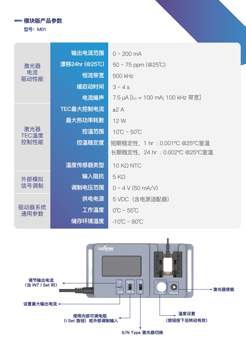 M01 超低噪声激光驱动与控制模块适用于驱动多种类型激光器,实现电流驱动和温度控制两大功能一体化,具有极低的电流噪声和温度漂移。广泛应用在各类激光光谱测量系统中,集成度高,稳定可靠,操作便利。